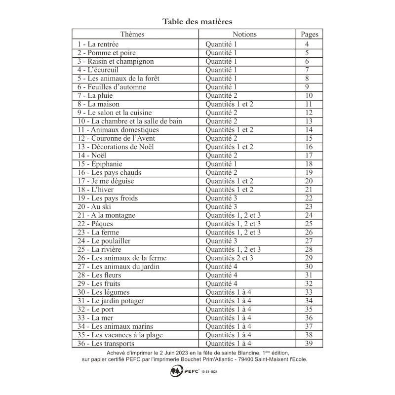 Chaque semaine comporte un thème qui est représenté en haut de chaque page par une petite image. Les illustrations des exercices correspondent à ces thèmes qui suivent le rythme des saisons. La liste se retrouve en table des matières à la fin du cahier.